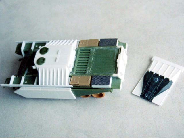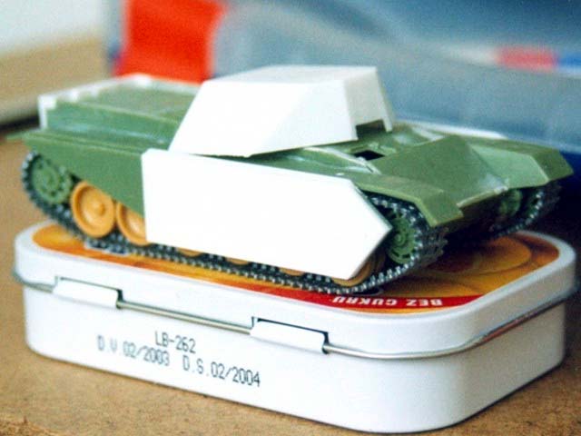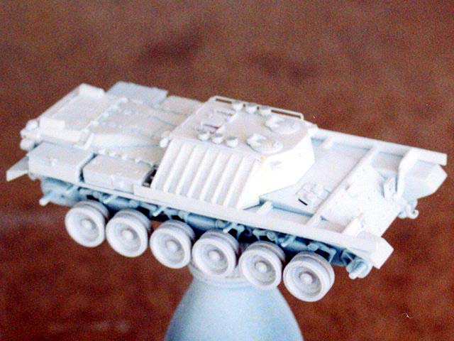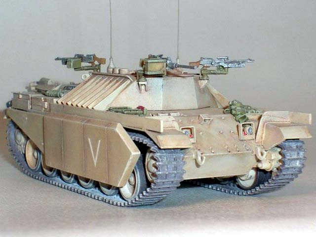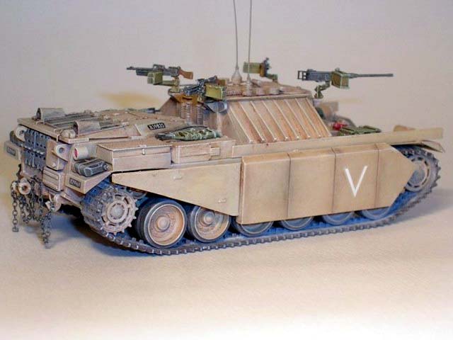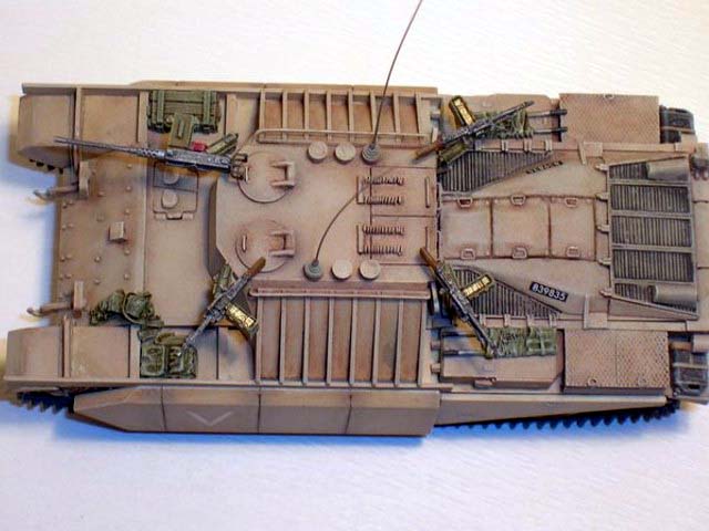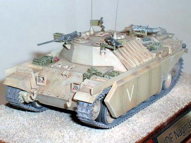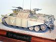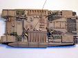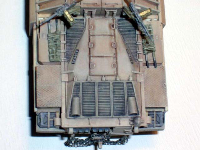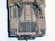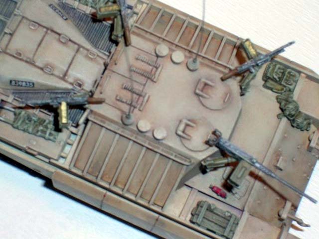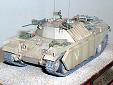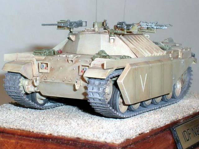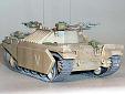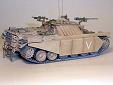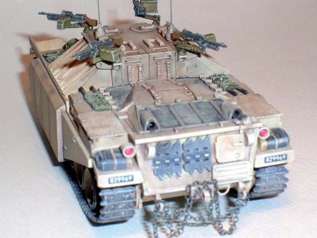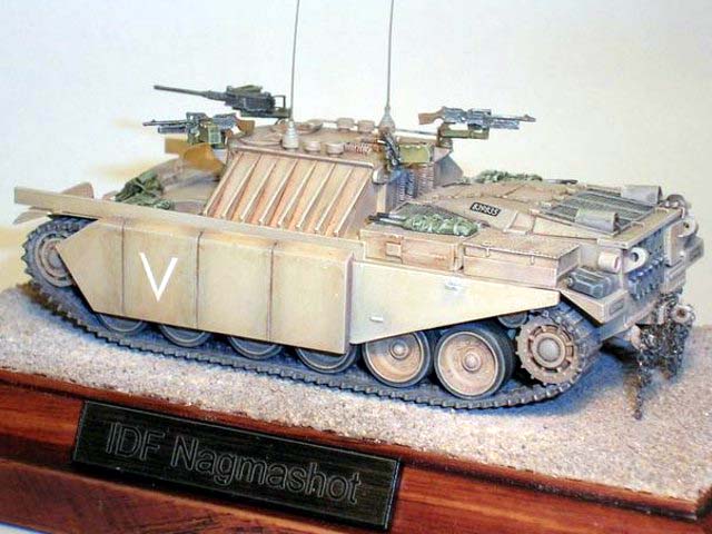 Základem modelu je upravená korba Centurionu od Airfixu. Použitá kola jsou z Merkavy od Esci s vyfrézovanými drážkami pro vodící trny pásů. Přední světla jsou z M113 od Italeri, upravená část krytu motoru a vzduchové filtry jsou z M60 čínské firmy Galaxy. Kulomet 50 palců je Extratech, ostatní zbraně a doplňky Goffy. Zbytek je scratch z polyuretanových destiček, profilů, tyčinek, proužků, drátu a plechů. Základovka je Mr. Surfacer 1200, barva je izraelská Modelmaster, hodně zesvětlená. Dále preshading, olejovky a pigmenty. |