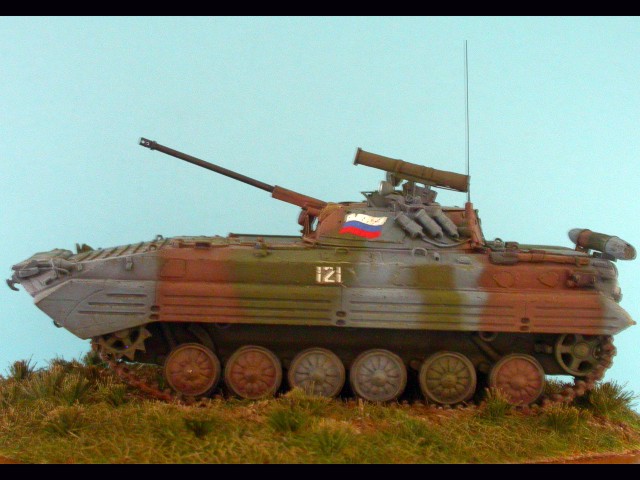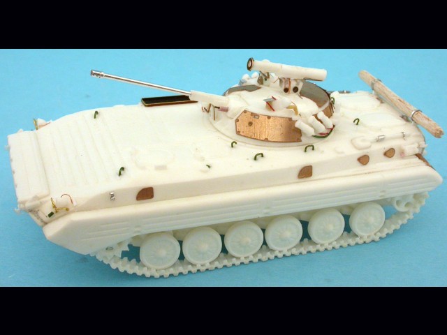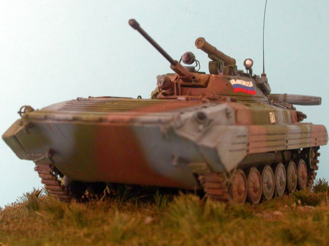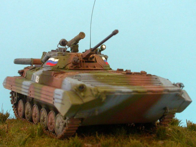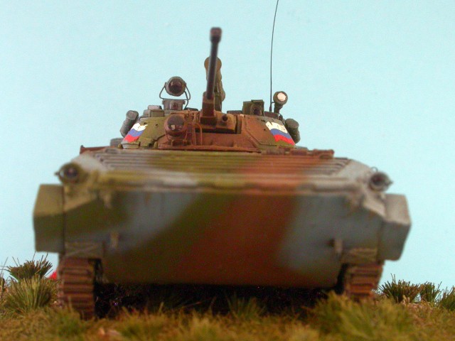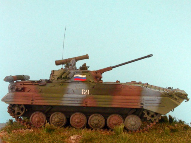 Tento model pozdní produkční varianty BMP-2 patřičně vyšperkovali lepty obsažené ve stavebnici, k nimž jsem přidal kovovou hlaveň od Arma a pár drobností vlastní výroby.