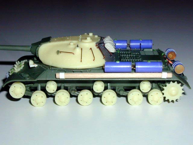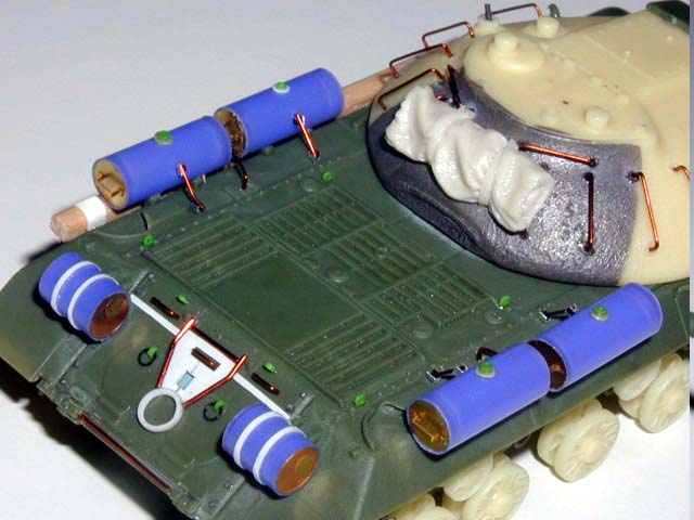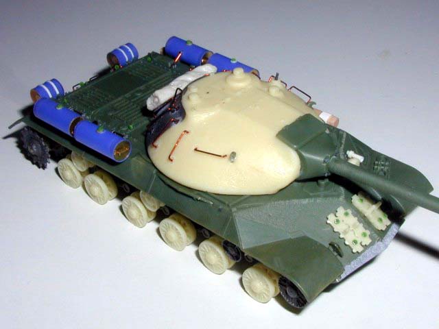 Měřítko: 1/72 Výrobce stavebnice: Roden Na tento těžký tank jsme udělali s kolegou opravný set, který obsahuje novou věž se stopami po lití, pojezdová, hnací, napínací kola a vodící kladky. Z modelu IS-2 od PST jsme převzali článkové pásy a tohle vše zaformovaly. Použití setu je vidět na fotografiích. Korba tanku zůstala původní a je na ní vyznačeno svařování a doplněny další detaily jako jsou matice a madla. Všechny nádrže jsou nové včetně jejich uchycení. Model je upraven dle fotografií na verzi 1945. Zbarvení je dle návodu tmavou zelenou a patina je provedena olejovými barvami. Metodou suchého štětce je znázorněno zesvětlení ploch a hran. |