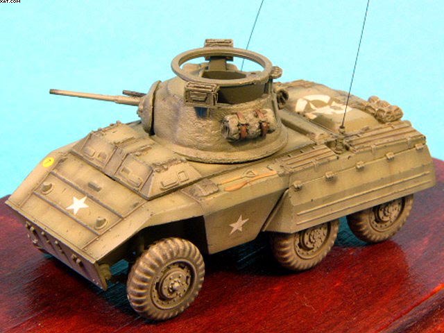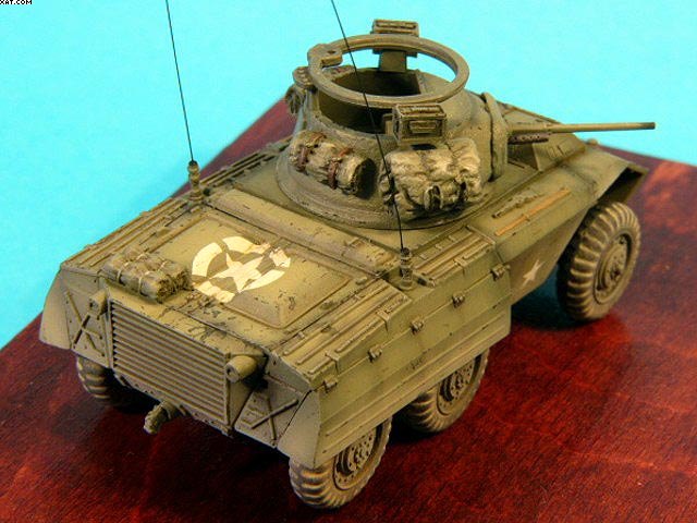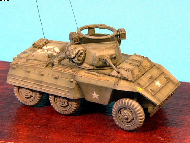 Mierka: 1/72 Výrobca stavebnice: Italeri Model je postaveny priamo z krabicky,bez vacsich uprav.Tmel som pouzil len na vezi a na naznacenie struktury pancieru som pouzil Gunze Surfacer 500. Ako doplnky su pouzite batohy od Goofy model.Model je nastriekany farbou faded Olive Drab od Model Master. Jedinou chybou stavebnice su nepresne koliecka a interier odpovedajuci verzii M20.Ale tieto nedostaky uz riesia doplnkeve sady od Calibre72,Eduardu a Extratechu. |