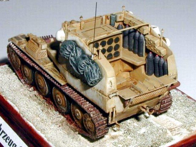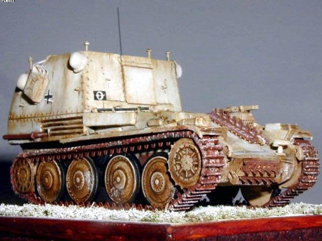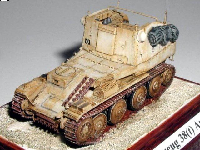 Použitá stavebnice: Attack Model Munitionsfahrzeug 38(t) Ausf. M jsem se rozhodl zařadit do své kolekce osmatřicítek, jelikož verzemi s motorem uprostřed se doposud žádný výrobce nezabýval a na trhu rozhodně chyběly. Jako velmi dobré hodnotím přidání malého leptu s drobnými díly, které model velmi oživí. Začal jsem dle návodu sestavením pancéřové vany a podvozku. Nyní přišel na řadu vrchní díl číslo 5, který se má v ohybu jakoby zlomit a přilepit na podvozkovou vanu. Ohyb jsem mírně proškrábl skalpelem pro lepší ohnutí, ale žádný problém zde nebyl. Svařovaný výstupek řidiče, jsem mírně upravil naznačením svárů, ale hlavně jsem jej o jeden milimetr posunul vpravo na hranu pancéřové vany. Na boku výstupku jsem naznačil nové nýty.Blatníky doporučuji lepit až po nalepení nástavby.Nástavba samotná je vylisovaná čistě a obsahuje detaily konstrukce a nýty. Celé díly jsem vyškrábal skalpelem a zeslabil. Při lepení nástavby je třeba postupovat opatrně a díly několikrát zkoušet nasucho napasovat než začnete lepit. Otevřel jsem zadní dveře bojového prostoru.Samotný interiér je dostatečně vybaven vším potřebným.Detaily jsou ztvárněny poměrně slušně, ale bohužel na některých místech jsou vtaženiny. Ty jsem zatmelil a krabice opatřil novými panty a přeryl je.Dal jsem své radiostanice, které jsem vybavil kabeláží, plynové masky a hasící přístroj. Kryt vysílaček jsem udělal ze slabého plastiku a vyvedl jím anténu. Bednu na munici jsem opatřil novým rámováním. Dolepil jsem sedačky obsluhy, na otevřená zadní vrata udělal z plechu žlaby pro pohotovostní munici a interiér byl hotov.Přibyl nový krycí plech otvoru v nástavbě z hliníkové folie. Z drátků jsem udělal nová madla, rám a držáky na plachtu. Bužírku z drátu jsem nakrájel žiletkou na slabá kolečka a nalepil na korbu jako očka pro přichycení maskovací sítě a plachty. Natáhl jsem z drátu nový výfuk a z leptu použil perforovaný kryt tlumiče. Lept obsahuje i děrovanou bednu na drapáky, která má přijít na levý blatník. Bohužel je vyšší než by měla být. Přesto jsem ji použil, poněvadž lepší bych asi nevyrobil.Dolepil jsem svůj notek a náhradní články pásů, na které jsem přilepil části ozubů z doplňkového leptu Attack. Vozidlo jsem ještě ověsil celtou, kanystrem a přilbami osádky z vlastních zdrojů.Kamuflážní schéma jsem si vybral z návodu a pochází od 2.Ski Jäger Division ze zimy 1944. Základní nástřik jsem provedl kamuflážní pískovou N 21 Agama, přes který jsem po zaschnutí nanesl matnou bílou Humbroll. Snažil jsem se podle návodu umístit všechny náboje do předznačených kroužků, ale nedařilo se mi to. Náboje se na počet nevešly a kroužky mi při lepení překážely. Nacpal jsem do interiéru maximum co šlo.Interiér přesto vezené náboje podstatně vylepšily.Obtisky jsou kvalitní a jejich umístění na model bylo bezproblémové. Zimní kamufláž smytelnou bílou barvou v povětrnostních podmínkách dost trpěla a opotřebovávala se. O totéž jsem se snažil i na modelu. Řídkou olejovou barvu jsem napouštěl do spár a kolem nýtů. Hustší olejovou barvou je naznačena stékající rez a špína. Na připravené nalakované dřevěné destičky jsem nalil směs sádry a dispersního lepidla Hercules a posypal molitanovou trávou. Ještě za mokra jsem obtiskl model do sádry, aby si v takto udělaném terénu udělal svou stopu.Povrch terénu je přestříkán bílou barvou a napuštěn špinavým ředidlem s olejovou barvou což vytvoří dle mého názoru špinavou zimní krajinu. Modely jsem přilepil do svých stop a vše přestříkal matným akrylovým lakem Agama. |