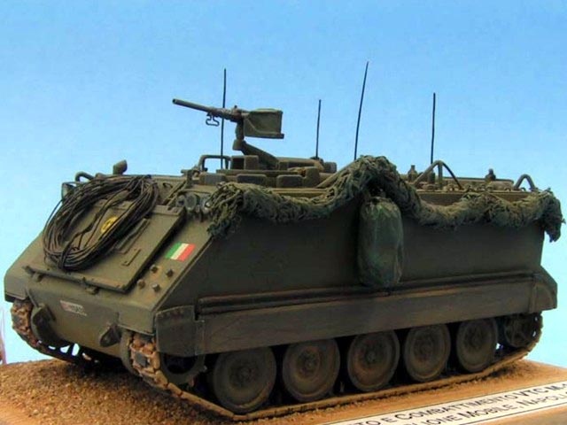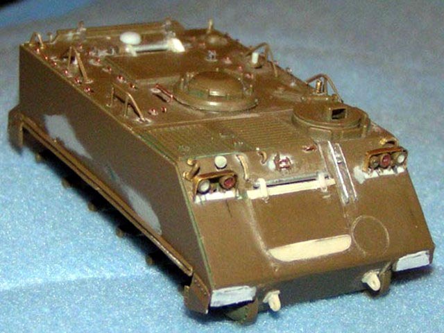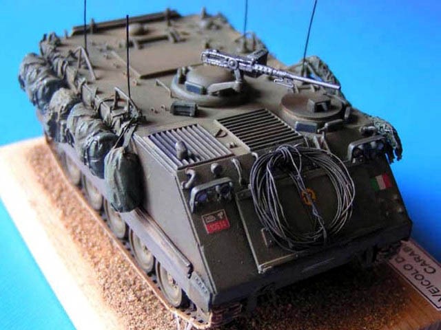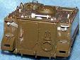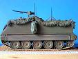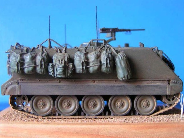 Podle dostupných fotek jezdily M-113 ověšeny spoustou výstroje uchycené na jakýkoliv volný úchyt nebo „naházené“ pod vlnolam či přivázané kam jen šlo na korbě. Vypůjčil jsem si tedy pár pytlů ze sady CMK na Bradleyho a dodělal maskovací síť ze stočené gázoviny. Na jednobarevné kamufláži pak už nebylo co pokazit. |