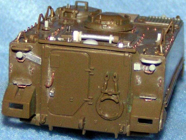 Slabinou tohoto modelu jsou detaily. Vlastně zde nejsou téměř žádné a tak jsem vylepšil pant poklopu k motoru. Poklop samotný pod vlnolamem není vidět, ale pant již trčí nad něj. Opravil jsem systém otvírání vlnolamu. Přední světlomety, které jsou velmi zjednodušeny a zadní vlastně také. Přední tažné oka chybí úplně. Oka na korbě uchycení vozidla na jeřáb také zcela chybí. Dále jsem dodělal pant poklopu výsadku, uchycení kanystrů ochranné rámy kolem antén a snad milion madel.