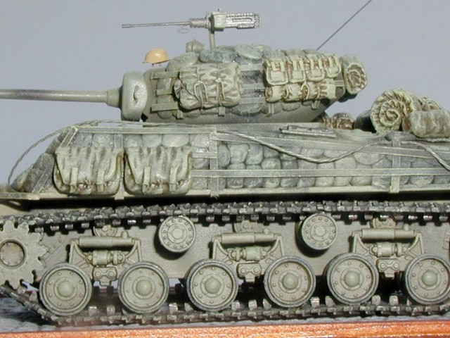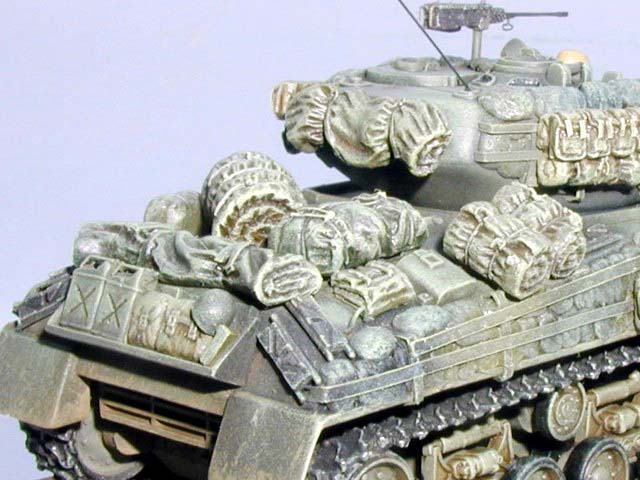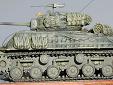 Měřítko: 1/72 Výrobce stavebnice: Hasegawa Starý model Shermanu od Hasegawy jsem měl rozdělán již delší dobu a jediné jeho štěstí bylo, že má jiný podvozkový systém než ostatní Shermany, které se v současné době lisují. Co se týče detailů model připomíná spíše hračku. Takže jsem jen nabíral sílu, abych jej dodělal. Zaujal mě stroj od 781.batalionu 100.divize z Francie, který je celý obalen pytli s pískem zasazenými do přivařených profilů na pancíři. Tím tank úplně změnil tvar. Pytle jsem udělal z dvousložkového tmelu. Profily jsou z hliníkové folie a jsou přilepeny až na pytle. Gumové pásy jsem vyhodil a použil resinové. Na tank jsem ještě doplnil větší množství batohů, celt a výstroje osádky. Kamufláž tvoří černé pásy stříkané přes základní olivovou. Celé plochy jsou zesvětleny a patinu jsem provedl olejovými barvami a metodou suchého štětce. |