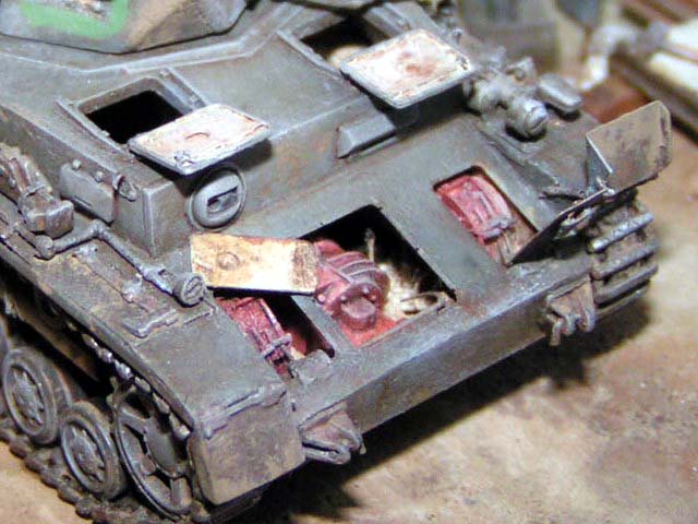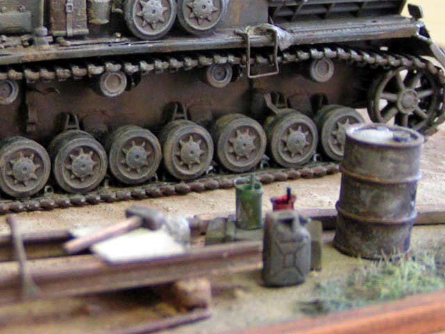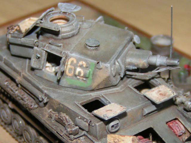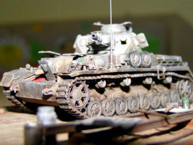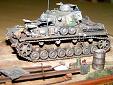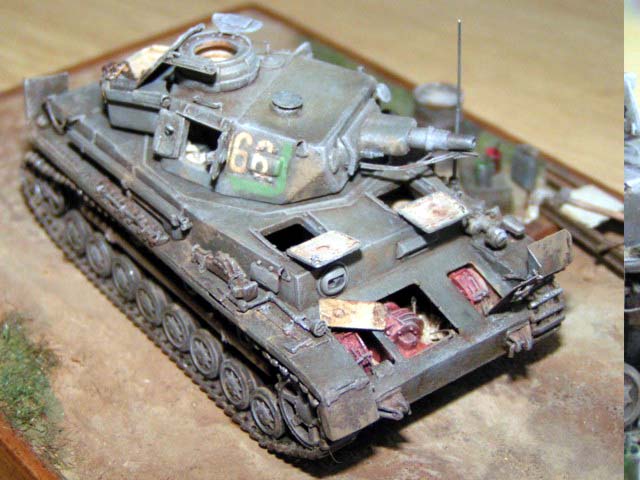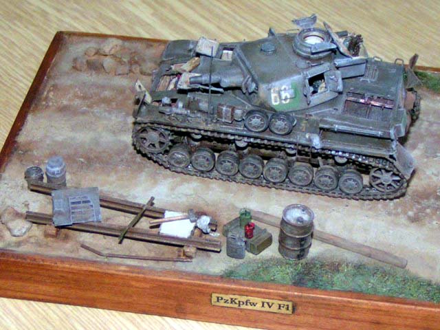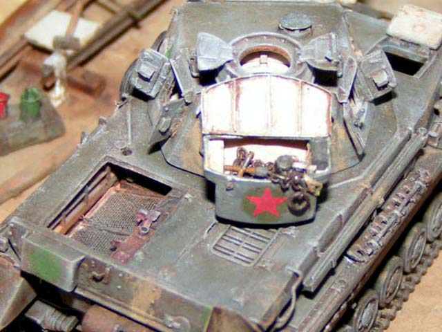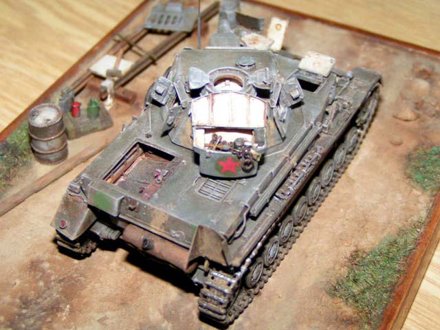 Měřítko: 1/72 Jako základ je použit podel Pz IVa od firmy Revell. Pojezdová kola jsou ze stavebnice Pz IV F2 - Hasegawa. Od Extratechu je interierový set a "plechy". Z vlastních zdrojů je dovybaven vnitřek korby a věže včetně závěru kanónu. Barvy Agama. Patina olejovými barvami a křídami. Nechal jsem se inspirovat ruskou publikací "Boj o Krym". kde je asi 6 fotek tohoto konkrétního stroje ze všech stran. Jedná se o stroj ukořistěný Rudou armádou na Krymu v dubnu r.1942, nachátející se v opravářské základně. Tank patřil 22. německé tankové divizi.Model byl stavěn jako soutěžní na mistrovství republiky 2004. Fotky: Milan Šenk |