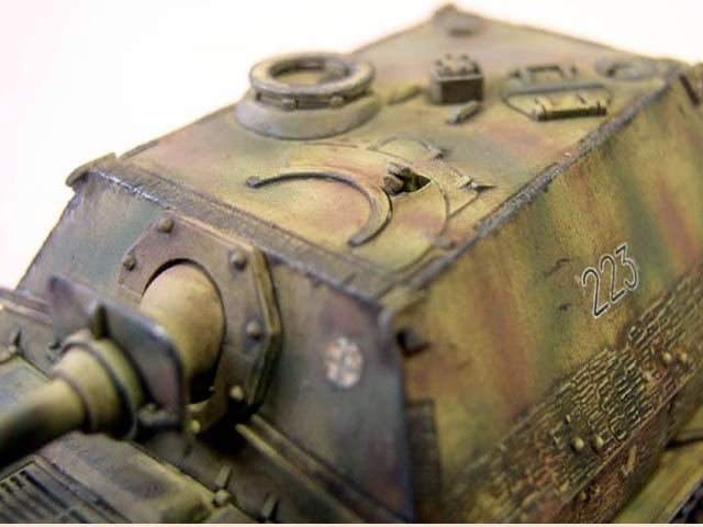 Měřítko: 1/72 Použitá stavebnice: Trumpeter Krom zimmeritu vytvořeného pomocí tmelu od fy Tamiya je model postaven z krabičky. Základ kamufláže jsem nastříkal a poté oplikoval olejové barvy, tuhou znázornil opotřebení a přidal pár "filtrů" syntetickými barvami. |