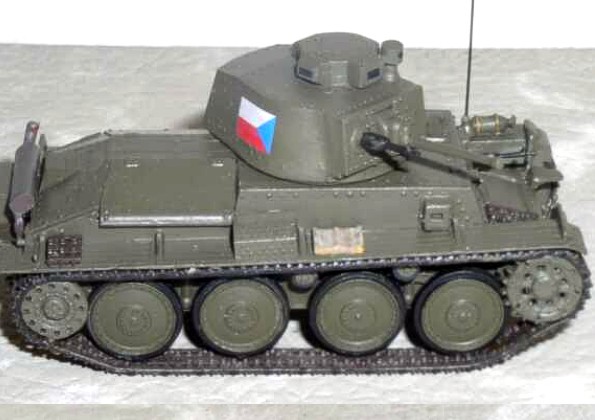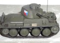 Výrobce : Attack, 1/72 Model je sestaven ze stavebnice Pz.38 Ausf.G od firmy Attack. Při stavbě jsem vycházel z publikace MBI věnované tomuto typu a dle fotografií a bokorysu v ní jsem i stroj dokončil jako jeden z čs. strojů z poválečných let. Naše armáda jich v té době měla téměř čtyři desítky. Model není téměř opotřebován a zašpiněn, neboť většina strojů musela krátce po válce projít změnou zbarvení. Několik kusů se zůčastnilo vojenské přehlídky na Strahově, předpokládal jsem tedy vypulírování strojů do dokonalé čistoty. Ale zpět k samotnému modelu. Jde sice o nejpřesněji zpracovaný model LT-38 v tomto měřítku, ale přesto mi jeho sestavení nepřipadá jako procházka rajskou zahradou. Jde o short-run a to je na mnoha detailech znát. Hlaveň jsem raději nahradil hlavní z modelu Pz.38 od Fujimy, tažné háky jsem si raději znovu odlil z resinu. Kulomety a další díly jsem po úpravách použil. Pro dokonalejší vzhled modelu však bylo potřeba mnoho dalších drobností vyrobit. Stavbu jsem jednou na delší dobu přerušil, musel jsem získat odvahu opět v ní pokračovat při stavbě něčeho jednoduššího. Současně s tímto modelem stavěný druhý kus v plánované alespoň přibližné podobě prototypu (neodolal jsem možnosti rozšířené poměrně chudé kolekce meziválečné čs. obrněné techniky) dosud světlo světa nespatřil. Zas až tolik sil jsem nenačerpal. :-) Ale i tak děkuji firmě Attack za poměrně dobré ztvárnění tohoto typu (co takhle ještě LT-35?) Modelu by asi výrazně pomohla sada drobností zpracovaná jako lepty. Praporový znak, registrační tabulka s číslem a černé obdélníky imitující pozorovací průzory na velitelsé věžičce byly vytištěna na tiskárně OKI DP-5000. |