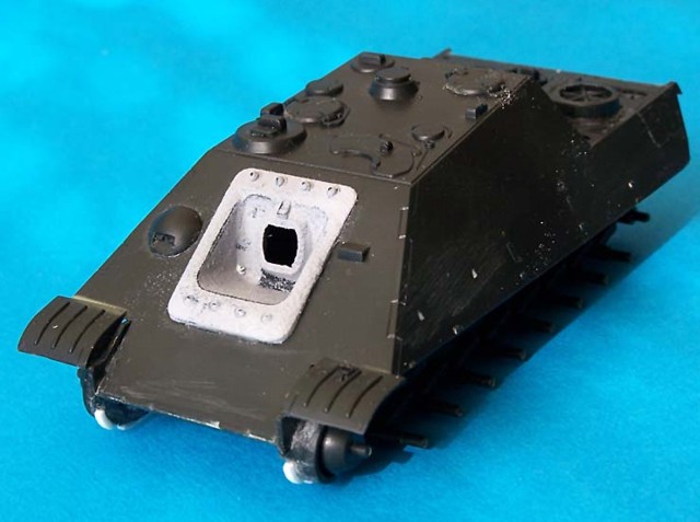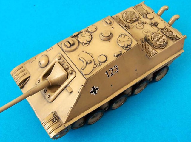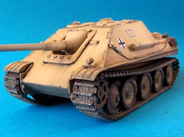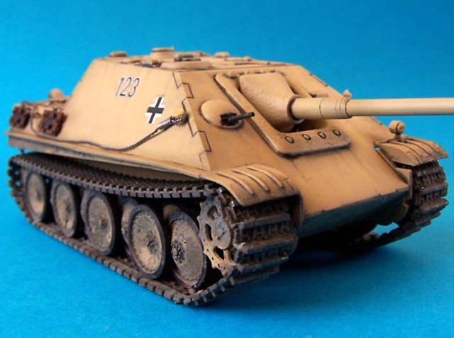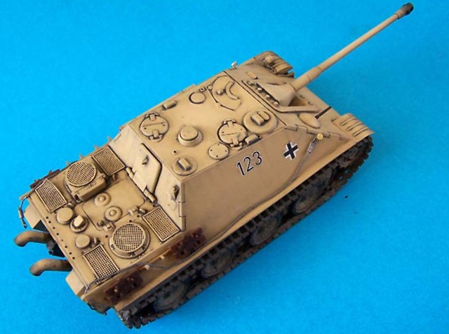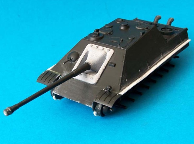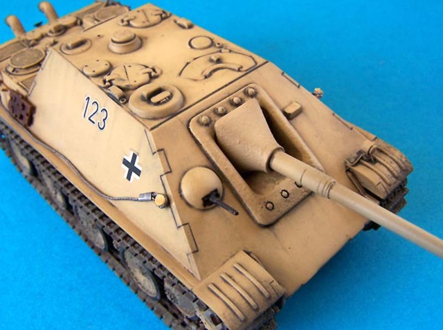 Model je postaven bez větších úprav, jediné co jsem dodělal jsou blatníky, naznačil litý pancíř pomocí surfaceru. Dále jsem doplnil sítě od Profikitu, které mě daroval Braňo Herain, tímto díky mu za ně. Lana jsou upletena z olověných drátků.
