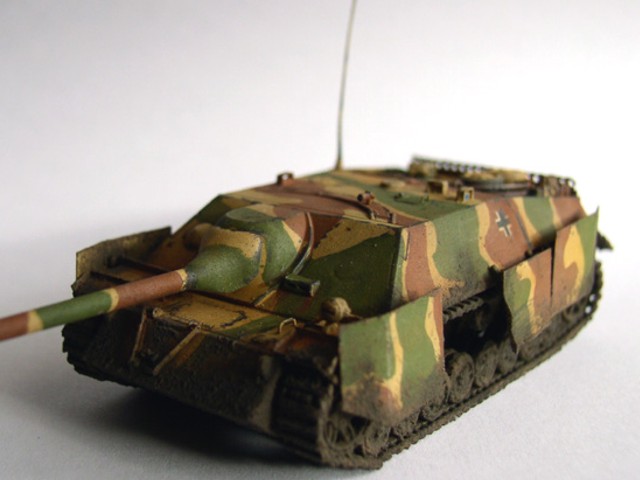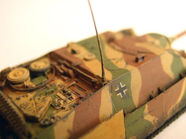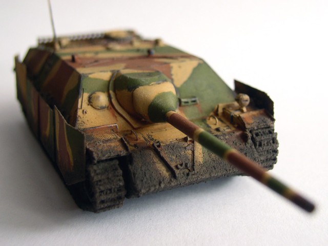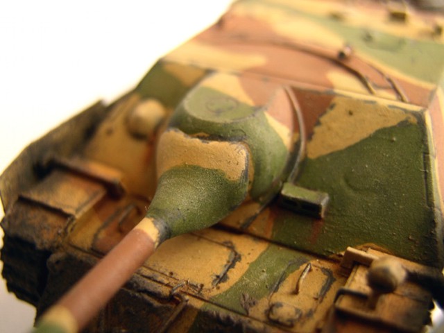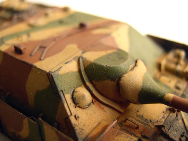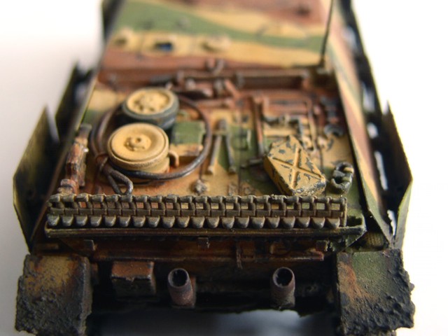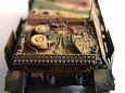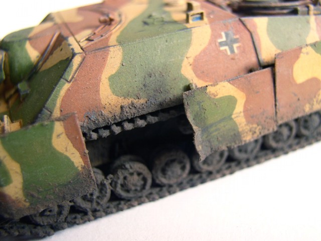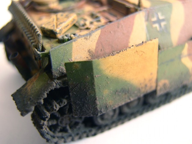 Základní stavebnici jsem vylepšil díly z Pz.IV J od Revellu (kola a pásy). lepty od Partu, kovovou hlavní Armo a pár drobnostmi vlastní výroby. Na kamufláž jsme použil barvy Humbrol, křídy na patinu a tuhu na odřeniny. Bláto tvoří zmel na dřevo, křídy a barvy Pactra.
