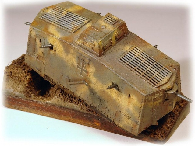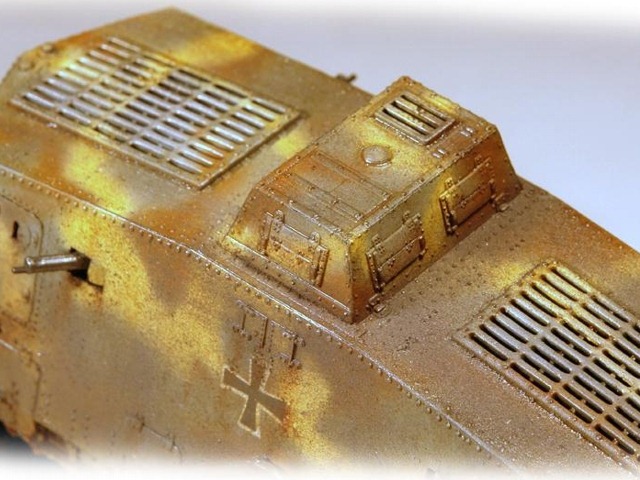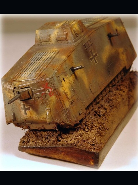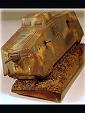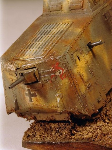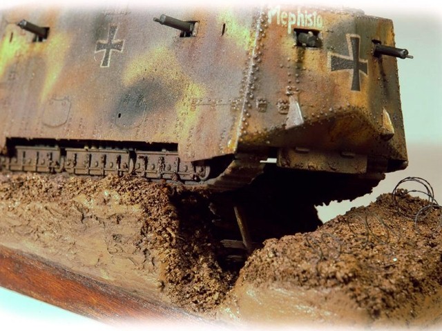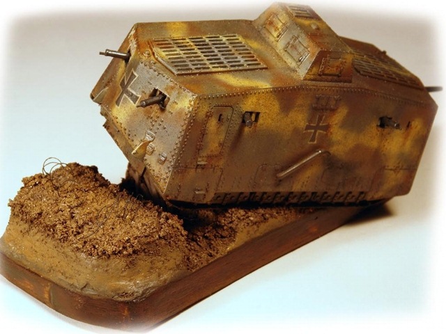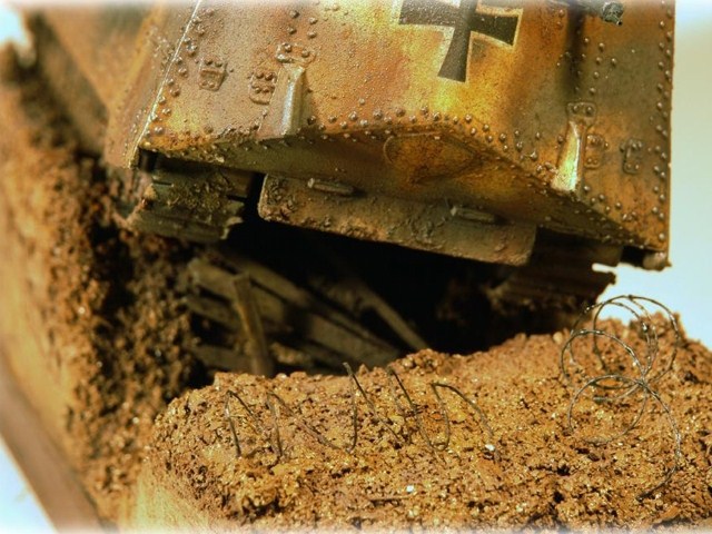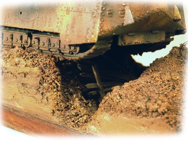 Model je postaven z krabičky, přičemž povrch je stříkaný, patinovaný olejovkami a nastrouhanými křídami. Podklad je sádra, káva s Herkulesem, vše kolorováno stříkáním. Vše pak fotografováno s makropředsádkou. |