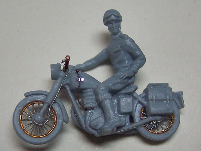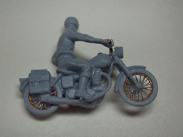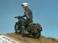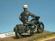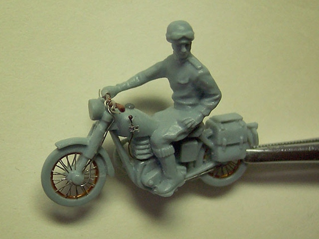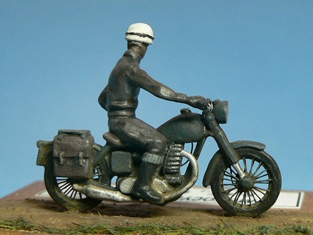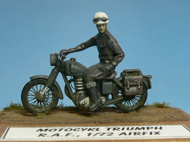 Výrobce stavebnice: Airfix Motocykl je součástí stavebnice RAF Recovery Set . Motorka je vylisována z jednoho dílu i s jezdcem, ale hezky. Je třeba však doplnit ráfky a špice kol z drátků, vyměnit nerealistická řídítka, doplnit bowdeny a páky brzd, kabely ke svíčkám a další. Další úpravy se týkají spíše řidiče, je dobré místa, kde se stýká řidič s motocyklem, alespoň proškrábnout, kvůli optickému oddělení jezdce od stroje. Podložku tvoří kousek dřevěné destičky, na které je ze sádry a statické trávy udělána imitace polní cesty. Barveno syntetickými a akrylovými barvami, patina olejovými barvami a pigmenty. |