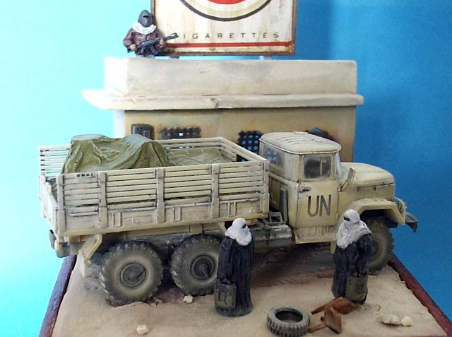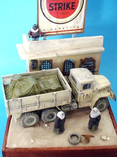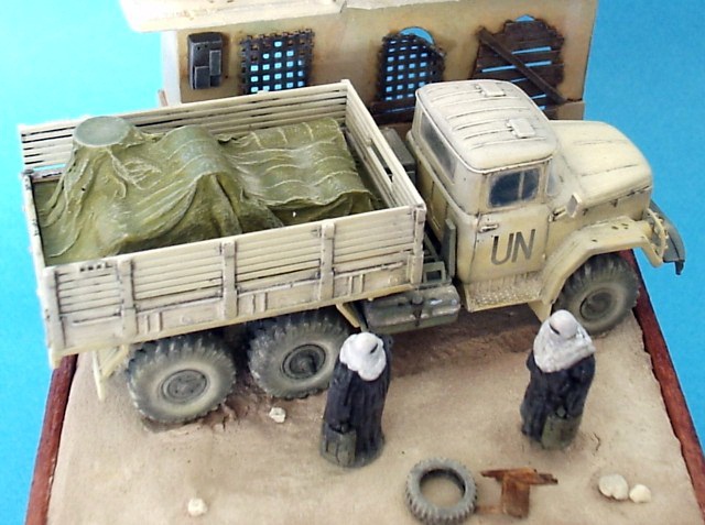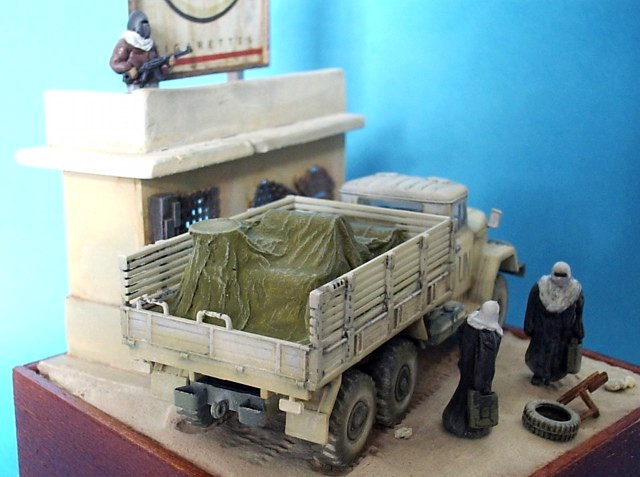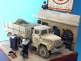 Model je postaveny z krabicky bez akychkolvek dorabok, pridal som len odlievany naklad od f.TPmodel. Nakladak je nastriekany akrylovymi farbami, patina robena olejovkami a Patinatormi. Na ozivenie som vyrobil kus domu a figurky tucnych arabiek z Miliputu. |