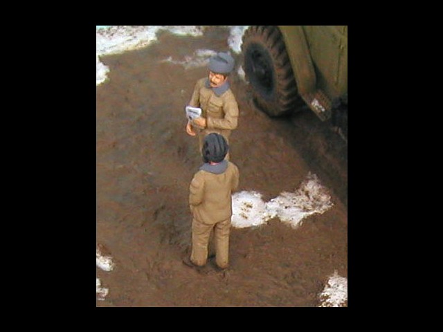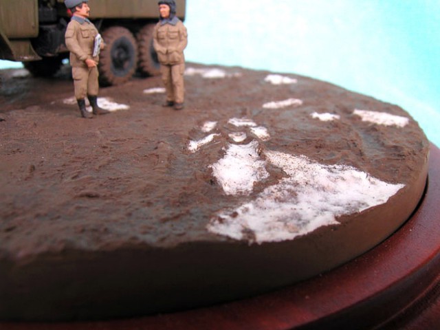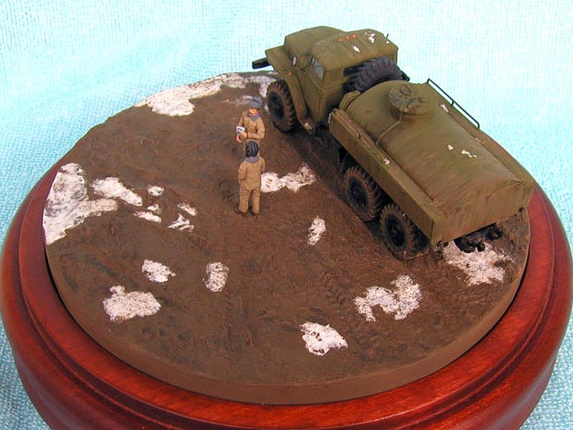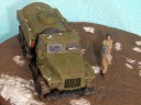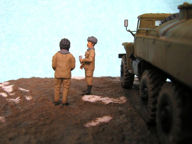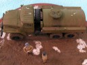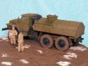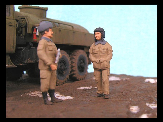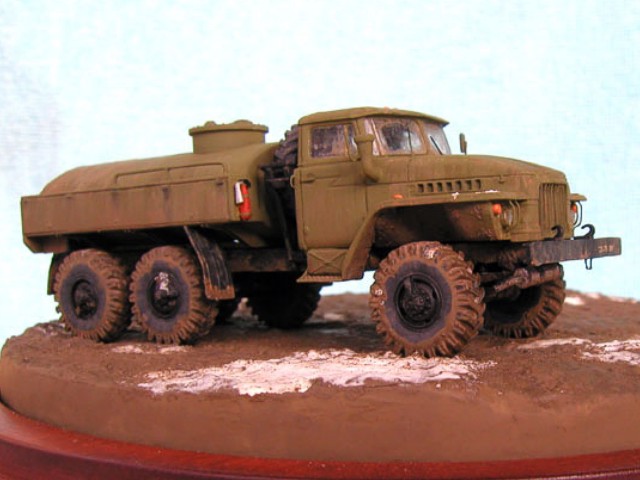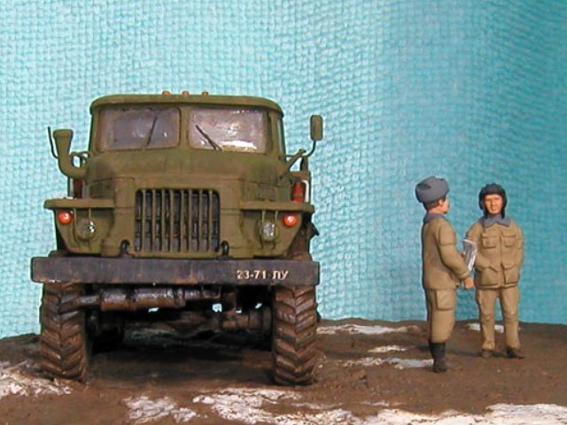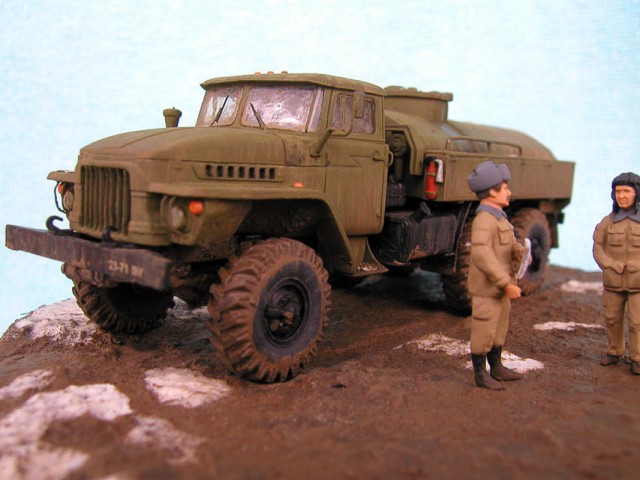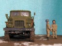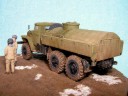 Měřítko: 1/72 Výrobce stavebnice: ZV Models Tuto stavebnici jsem zakoupil víceméně náhodou. Měla totiž pěkně průhlednou kabinu a obsahovala kamufláž z Afghánistánu. Hned, jak jsem dorazil z obchodu domů, jal jsem se pátrat po nějakých zajímavých fotografiích originálních vozidel. Bohužel to nebylo, tak snadné, jak jsem si původně myslel. Obrázků jsem našel jen pár a ještě ne moc detailních a na cisternu jen jeden. Půjčil jsem si Concord "Afghanistan War" a našel v něm pouze jednu fotku Uralu 375 a to ještě Grad (omylem nazvaný Ural 4320). Mám také jeden časopis Steel Masters (#34 Srpen/Září 1999), ve kterém je článek o Gradu se čtyřmi fotkami Uralu 375.. Vady stavebnice: okna jsou příliš silná a zdeformovaná, mříž přední masky je také příliš silná, ve stavebnici je pouze jedno madlo pro vlastní cisternu, chybí také boční madla a stupačky, držáky zrcátek a přední blatníky mají špatný tvar. Všechny větší hladké plochy na dílech mají povrch jako po odrezení. Musel jsem tedy použít hodně tmelu, zejména na kabině. Úpravy: madla na cisterně vyrobená z plastu, další madla, stupačky a držáky zrcátek vyrobené drátku, upravený tvar předních blatníků, ochranné rámy světel jsou také z drátku, vlastní světla jsou z gelového vteřiňáku, stěrače jsou z drátku a kousku leptu na T-34/85 od Partu a mřížoví přední masky je ztenčeno skalpelem a brusným papírem. Podle návodu jsem k nabarvení použil barvu Humbrol H159 ale nejsme si jist, zda není příliš světlá. Podklad je vyroben ze sádry s nátěrem Humbrol H29 smíchané s trochou černé a nástřikem lakem. Sníh je prášku do pečiva. Figurky jsou od MIG Productions (koupil jsme je v Náchodě). Mají skvělé obličeje, ale oblečení a pokrývky hlav jsou trochu přehnané (zejména kožešina je příliš hrubá). Na zjemnění jsem proto použil trochu tmelu. Tankistovi jsem doplnil interkom z drátku a podbradek z papíru. Voják v beranici má nohy ze setu od Preiseru a kapsy vyrobené z kousku plastu. Pravou ruku má upravenou a na obou má dlaně od Preiseru, protože původní byly příliš velké. |